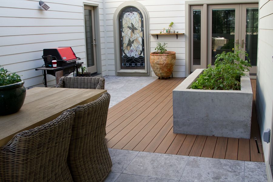 - 由回收材料制成——大多数品牌的复合甲板包含一些回收材料的数量。例如,TimberTech使用12%消费后回收塑料,以及锯屑回收的家具和其他木工行业。这是一个为LEED项目+。