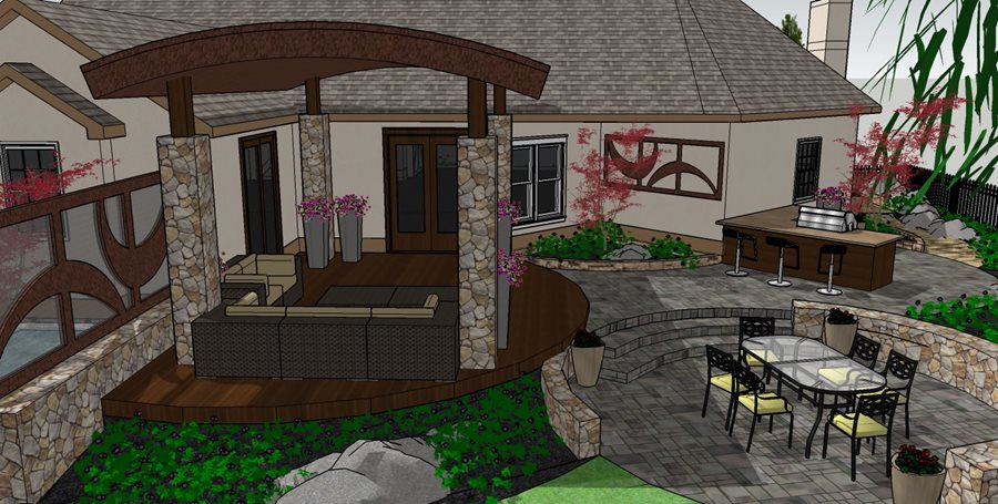 客户一直要求舒适,森林的寻找他们的景观,根据查克·爱德华兹Breckon土地设计公司在花园城市,ID。然而集成带回家的直线更自然的设置可以构成设计的挑战。爱德华兹在这个计划模型,设计了一个第二个故事甲板俯瞰一个圆形天井和草坪,然后包围了景观与常青树和巨石质朴的外观。甲板上的直线与建筑协调由下面的圆形天井软化。
