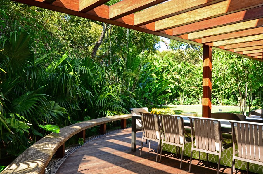 总裁根据刘易斯Aqui刘易斯Aqui景观+建筑设计有限责任公司,这个属性在科勒尔盖布尔斯的室外区域,佛罗里达曾经疲惫和乏味。“房主想给小草坪,庭院整容,适合他们的年轻和有趣的人物,”他说。现有的飞溅池和隐私的墙壁被纳入新的设计。“我们的愿景是创建一个时尚和当代设计,然而热带和郁郁葱葱的一系列户外房间,业主可以享受所有时间与他们的孩子和朋友,”继续Aqui。