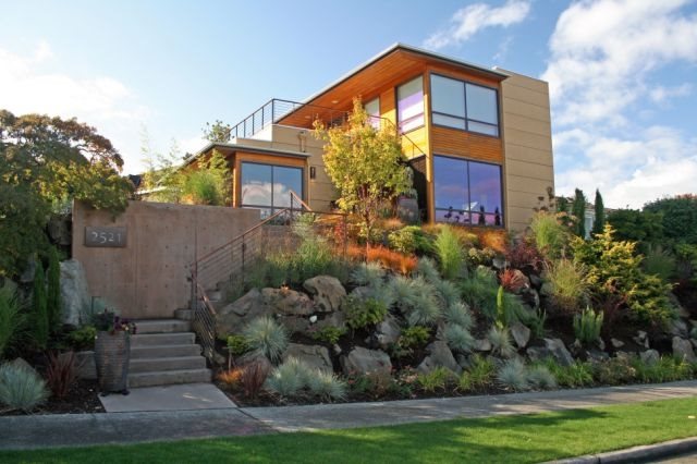 许多业主面临的挑战绿化倾斜的前院。标准的解决方案是经常地被覆盖山顶,这并不总是最美观的选择,有时可以成为入侵。这个属性,坐远高于街面,陡坡种植着各种各样的草,多年生植物选择提供最大的利益。石头被用来帮助保持土壤。