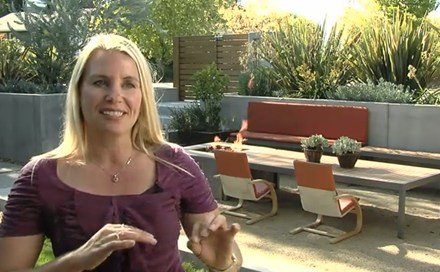 看到混凝土、豆砾石和风化花岗岩使用在这个院子里创建一个现代的外观。